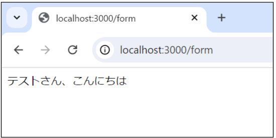 });こちらも早速ブラウザで実際に確認してみましょう。サーバーを再起動して、URL「http://localhost:3000/test」にアクセスします。