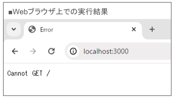 これは、サーバがアクセスを受け付けたものの、要求されたGETリクエストに対するコンテンツが存在しないことを示していますが、この表示が確認できれば、Expressを使ったWebサーバの起動は成功です。