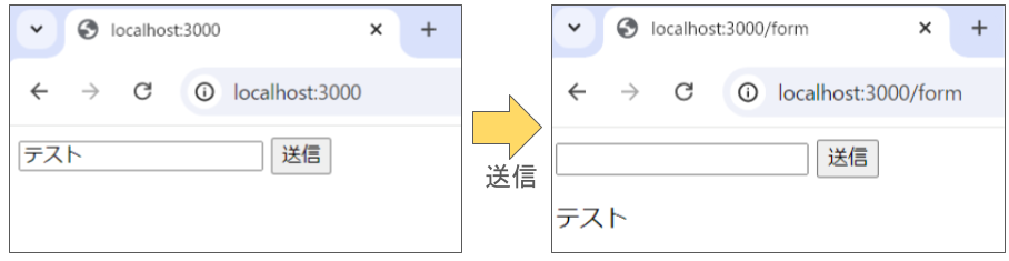 });上記のgetメソッドの記述では、<form>タグを使用して、送信ボタンを押下して「/form」ページにPOSTリクエストを送信できるように入力欄とボタンを追加しています。