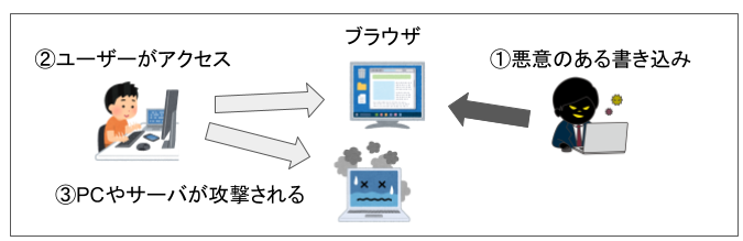 簡単に例で説明しますと、攻撃者がホームページなどに実行させたいJavaScriptのコードを書き込み、他のユーザーがそのホームページを読み込んだ際などにJavaScriptが実行され、ページを読み込んだユーザのパソコンや、ホームページが表示されているサーバーなどが攻撃されるようになります。