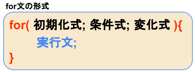概要:for文は決められた回数だけループ処理を繰り返します。for文はキーワードの後に「()(括弧)」をつけ、括弧の中に「;(セミコロン)」で区切った 3 つの式(「初期化式」「条件式」「変化式」)を記述します。括弧の後ろにはブロック「{}(中括弧)」を付け、ブロック内に実行文を記述します。