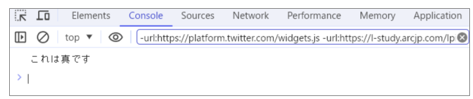 上記の例では、条件式が「真(true)」の場合、console.log()が実行され、「これは真です」と表示されます。ちなみに、上記の記述例は構文的に問題ないため処理が実行されますが、本来、if文は基本的に「変数」の真偽を判断するために使用するため、真偽を判定することが可能な内容が記述されます。