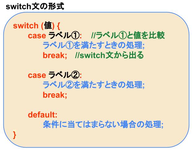 if文と同様に、switch文はキーワードの後に「()(括弧)」を付け、ブロック内に条件分岐の処理を記述します。if文との主な違いとして、switch文には「case」節があり、条件式と比較する値を記述します。case節の後には「ラベル」を記述し、ラベルが比較対象の値と一致した場合、case節の後ろのステートメントが実行されます。各ブロック内の処理の終わりには「break」文を記述し、switch文から抜け出すために使用します。(もしbreak文の記述が無い場合は、その後の処理が続いてしまうため注意が必要です。)