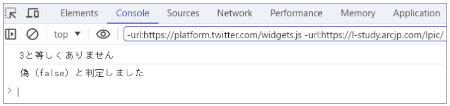 上記例の条件式「my_number == 3」は左右のオペランドが不一致のため、elseキーワードの後ろの2つのステートメントが実行され、「3と等しくありません」と「偽(false)と判定しました」が表示されます。