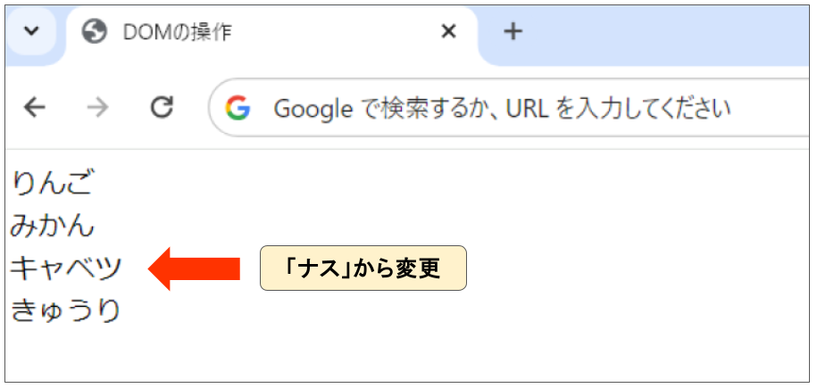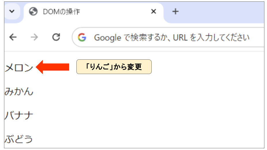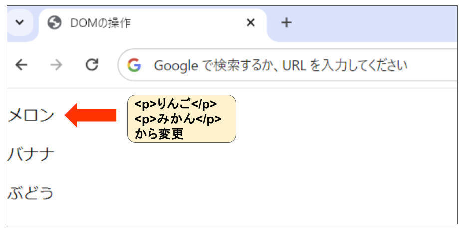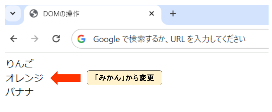 上記では、idが「orange」の要素を取得し、その要素内のテキストを「みかん」から「オレンジ」に更新しています。