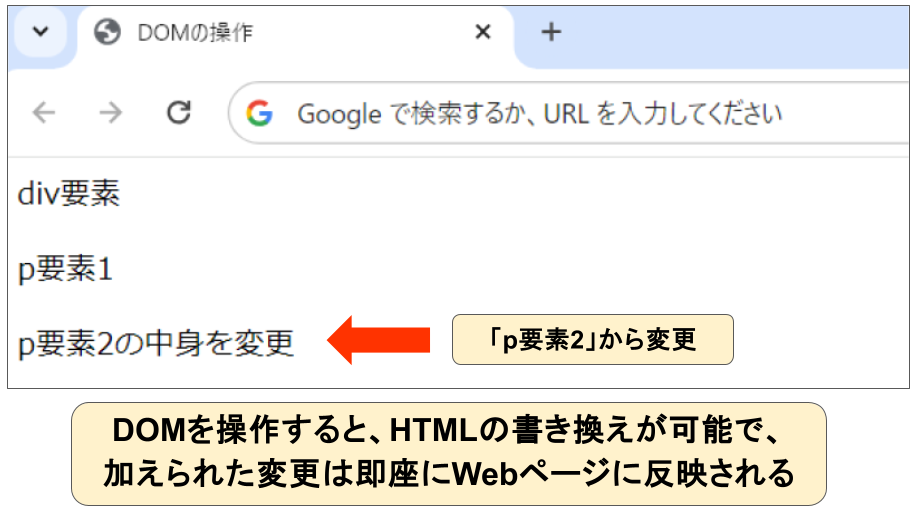 更にinnerHTMLを使用して「p要素2の中身を変更」というテキストを代入することで、要素内のテキストが書き換えられWebページに変更が反映されて表示されます。