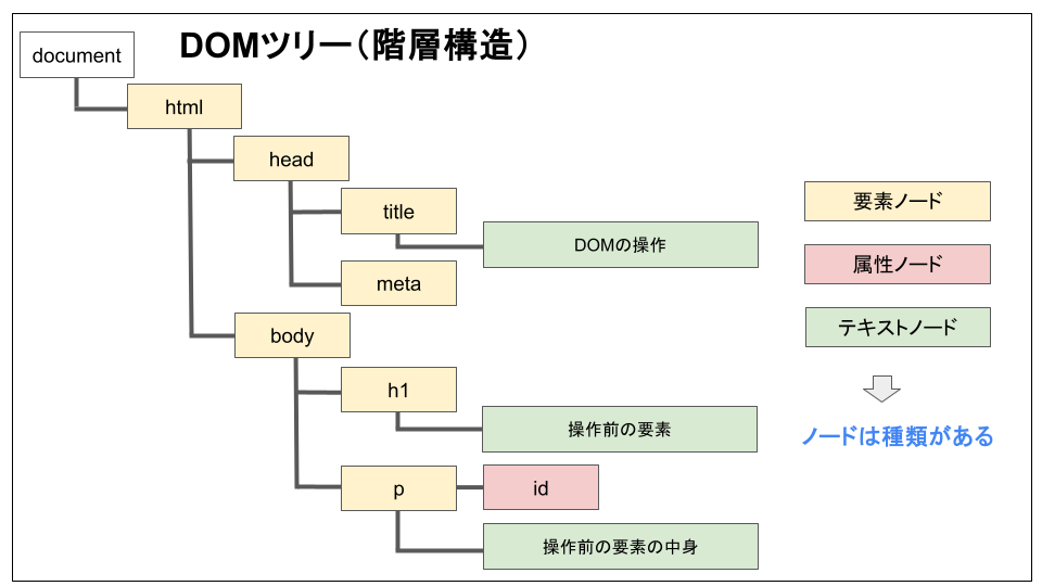 </html>DOMはHTMLを「DOMツリー」という形で表現しており、「document」というオブジェクトが最上位のDOM要素と位置づけられています。このオブジェクトから他のすべての要素が分岐し、各ノードが親子関係を持って、階層構造が形成されています。
